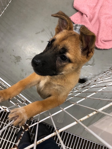 しもみちゃん、2か月ぐらい、成犬時の体重は14-17㌔ぐらいが平均値。お顔の黒い部分は少しずつ薄くなりますが、ベルジャン・マリノア風(ベルジャン・シェパードの一種)です。