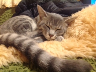とってもイケニャンなかん太くんです。 保護猫としてはとても珍しいグレーの虎柄でハンサムなニャンコです。 昨年の夏に里親さんにもらわれました。 いつも自宅でお仕事しているパパにべったりだそうです。 幸せそうな写真を見ていると保護活動の励みになります。