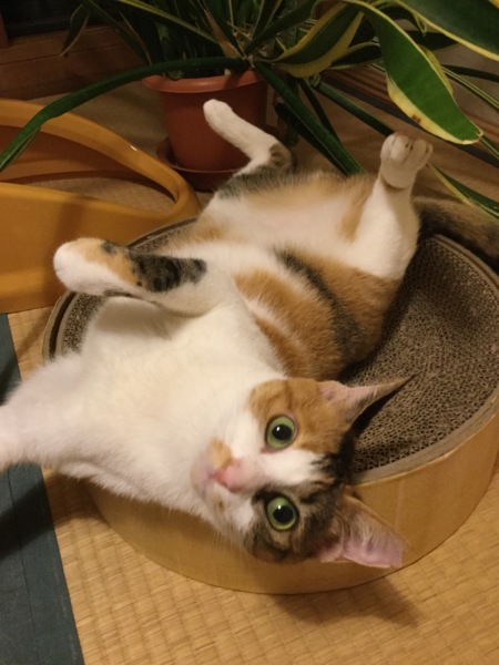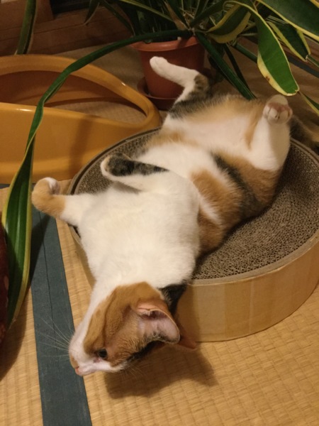サラちゃん、爪とぎの上でリラックス~♪ エアコンのきいたお部屋で快適ですね。
