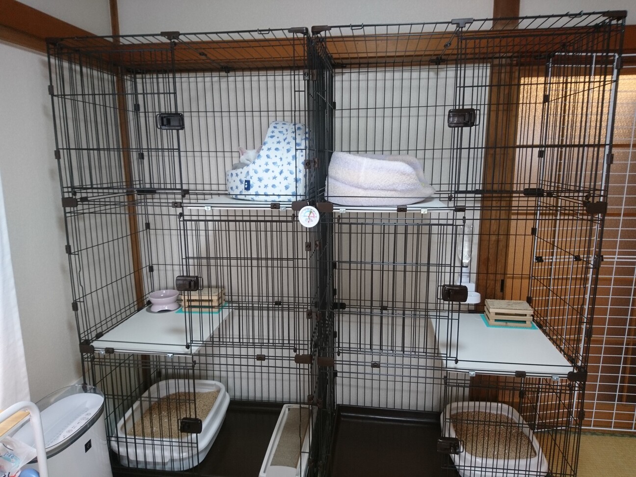 基本的にケージフリーにしていますが、家猫修行の初期や体調不良のときはケージ内安静をとっています。