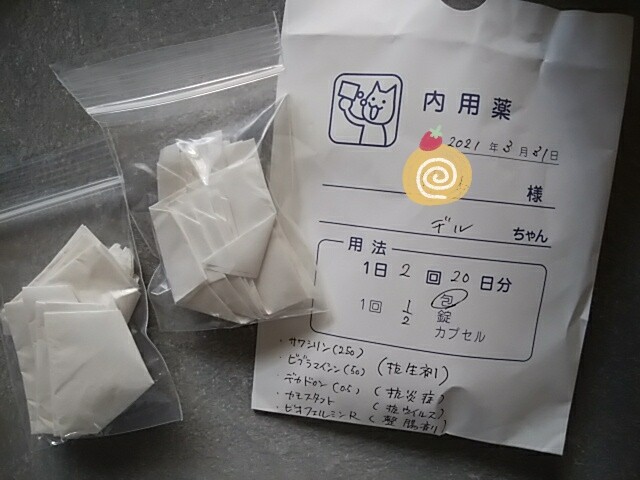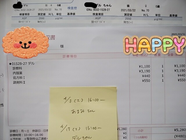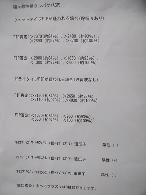 デルちゃんの検査結果です。ヘモバルトネラは3種類あるそうです。FIP確率90%はビミョーな感じらしいです。 今日の体重は2.66kg、少し増えていました!熱は39.2℃と少し高めでした。 元気・食欲はあります。もりもり食べています。皮膚が白っぽいのや黄色っぽいのはかなり改善しました。ヘモバルトネラはもう大丈夫そうです。(もう少し投薬治療は続けます) このまま投薬治療して、4月半ばに血液検査します。治れば良いなぁ。