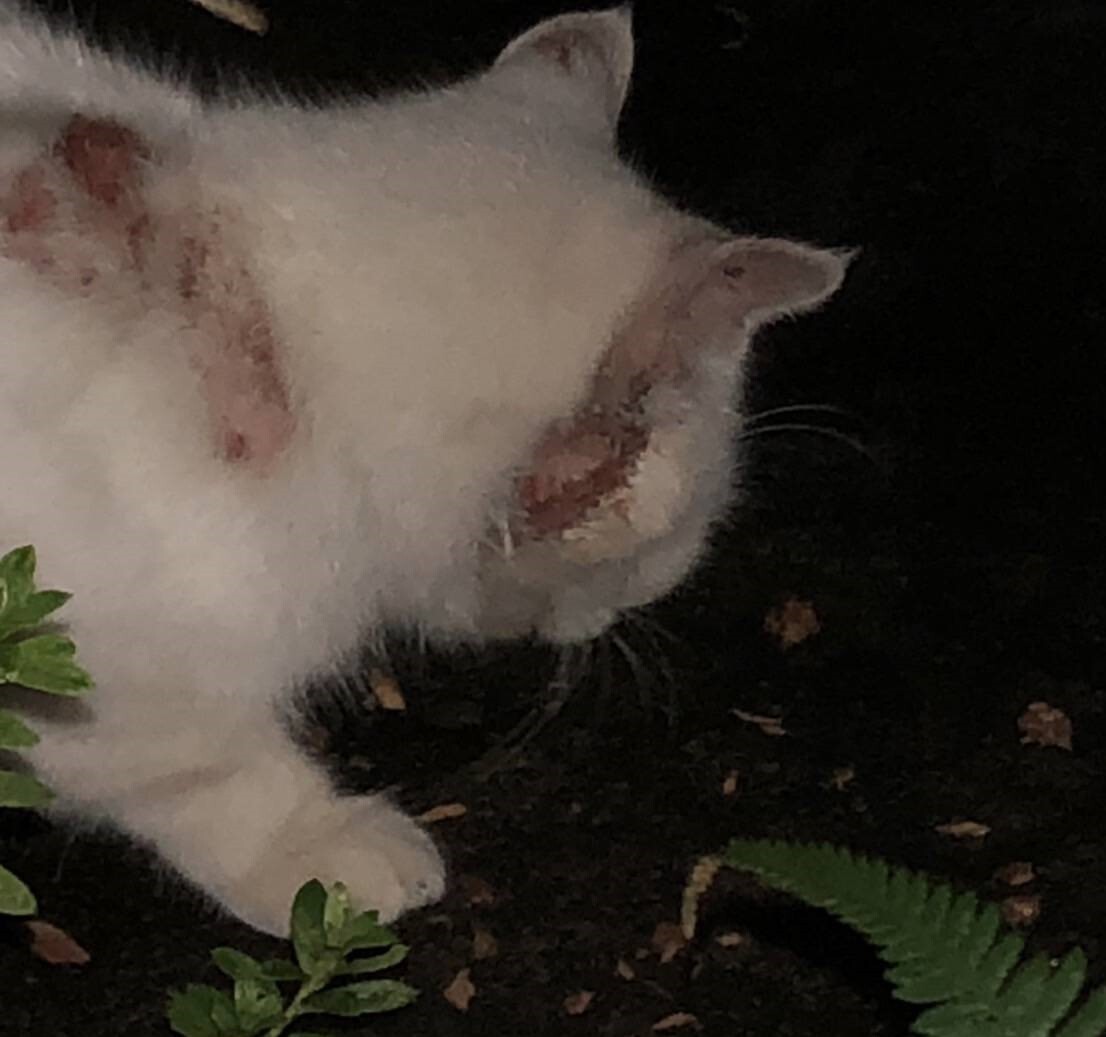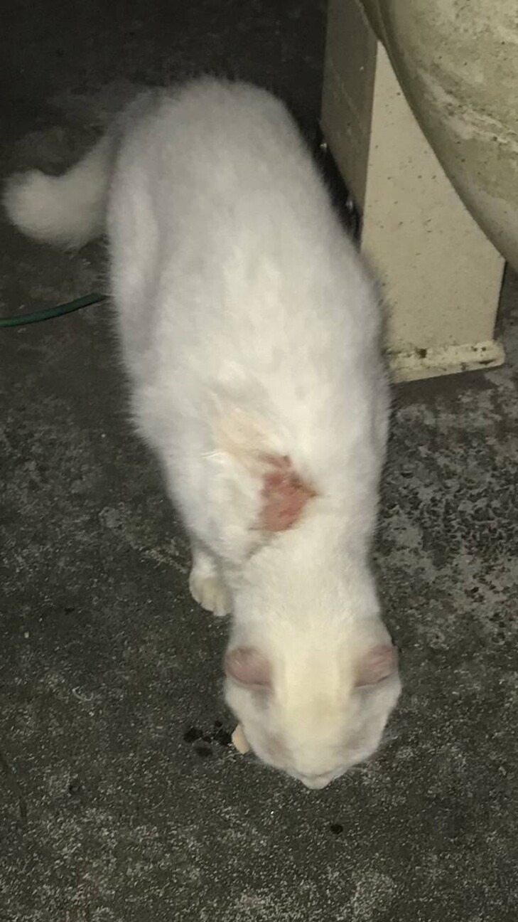 10/9日の譲渡会の会場で、「ケガをしている白猫がいる。耳カットされていないので避妊去勢手術もしてあげたい」との相談を受けました。