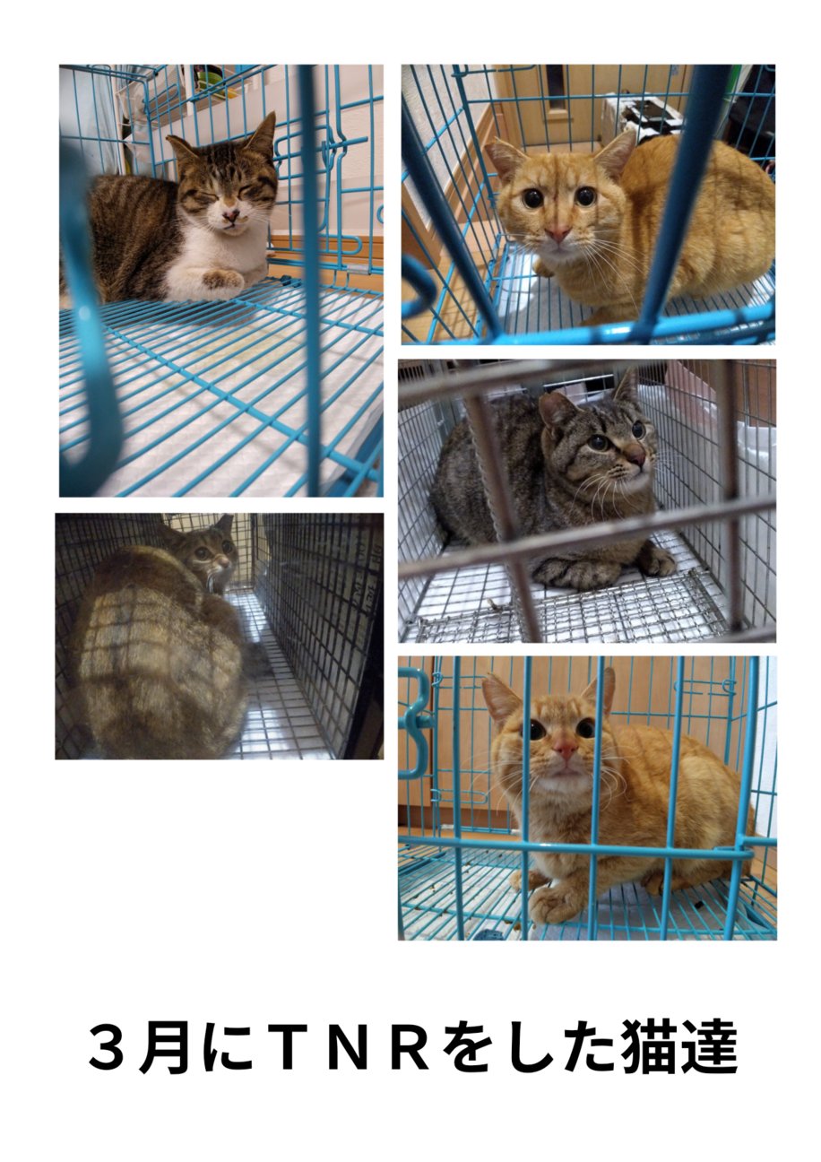 3月の活動報告です。 2ヶ所でTNRを行い合わせて5頭がさくら猫になりました。 費用はどうぶつ基金さんに2頭分ご負担いただき、3頭分は自治体助成金を申請予定です。 ワラビー動物病院さん、はとがや動物病院さんで行いました。 いつもありがとうございます。 また仔猫1頭の保護と妊娠している猫1頭を保護しました。 妊婦猫についてですが、いつ産まれるか分からない状況のため落ち着きましたらご報告させていただきます。 引き続きよろしくお願いします。