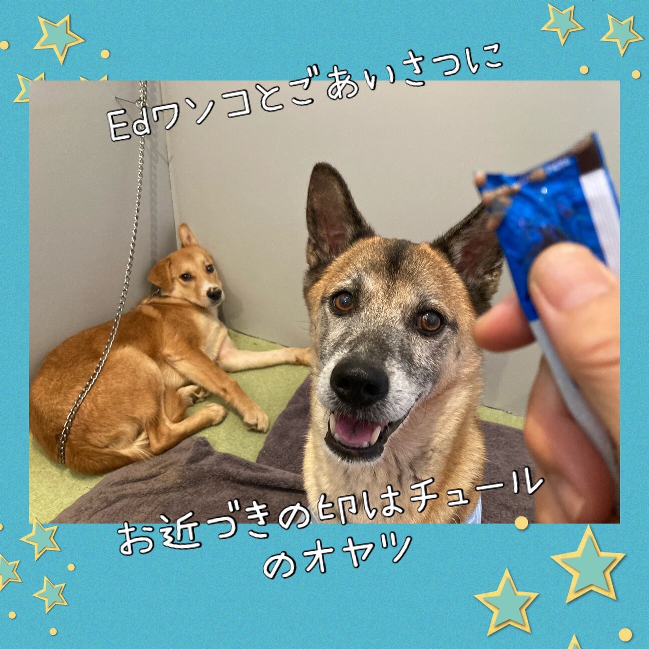 シュル君、まだブースのカーテンを閉めて、環境に慣らし中ですが、倉敷市保健所出身で保健所ボランティアワンコのEdワンコと訪問してみましたよ。元野犬だったワンコはワンコを見ていろいろ判断したり、学んだりするので、ヒトになれたワンコ投入は慣らしの促進剤になります。