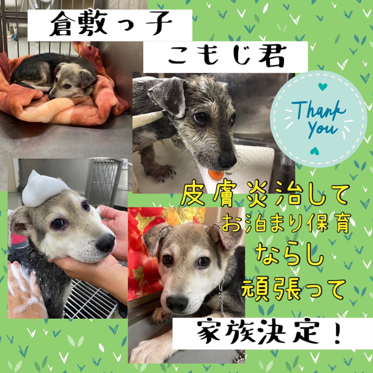 倉敷市保健所に初夏に保護された、やせっぽちで、皮膚の毛もまだらなお山生まれの子犬、こもこも兄弟姉妹3頭のうち、なかなかご縁が繋げなかった、こもじ君に、ついにずっとの家族ができました!