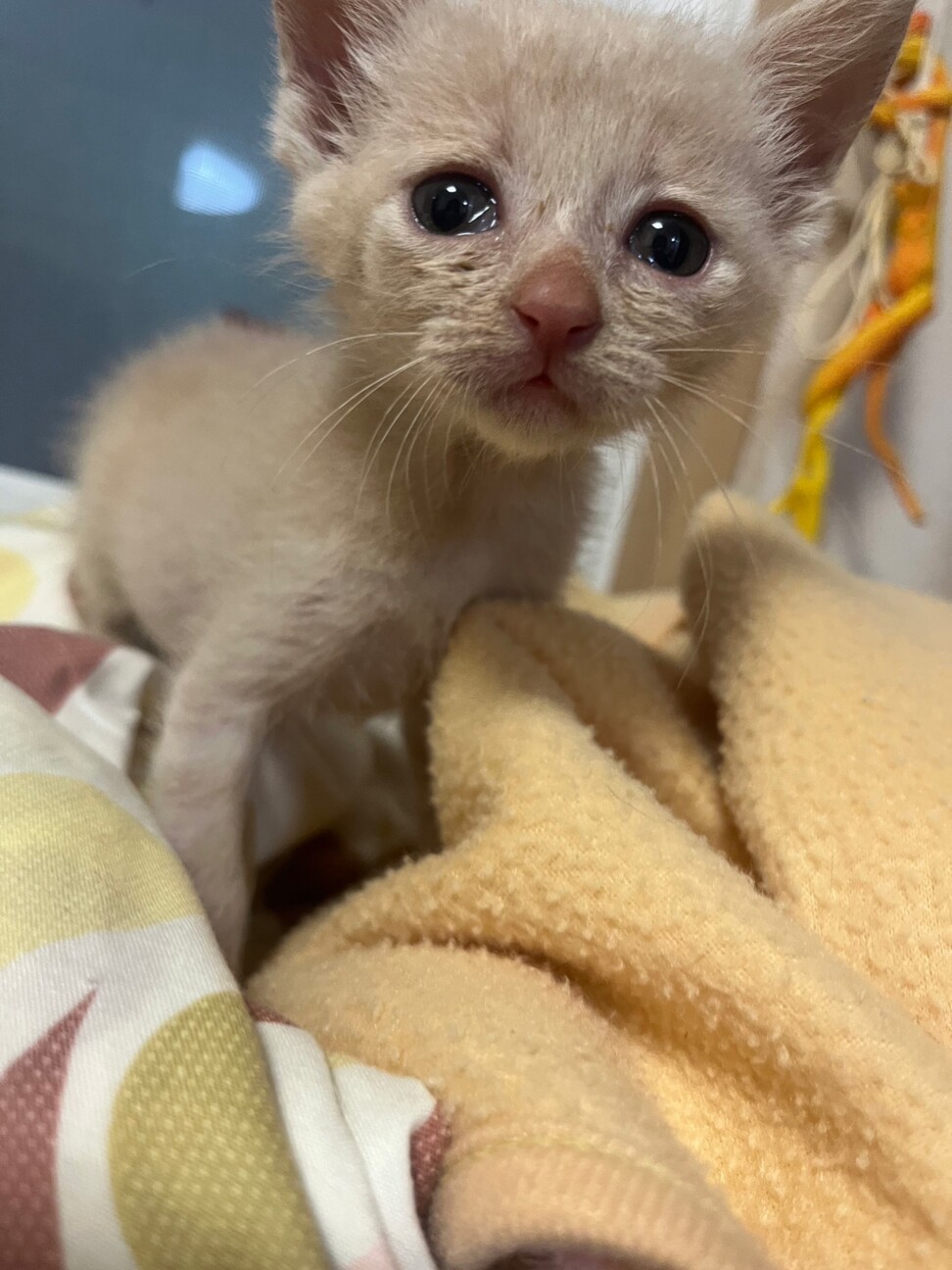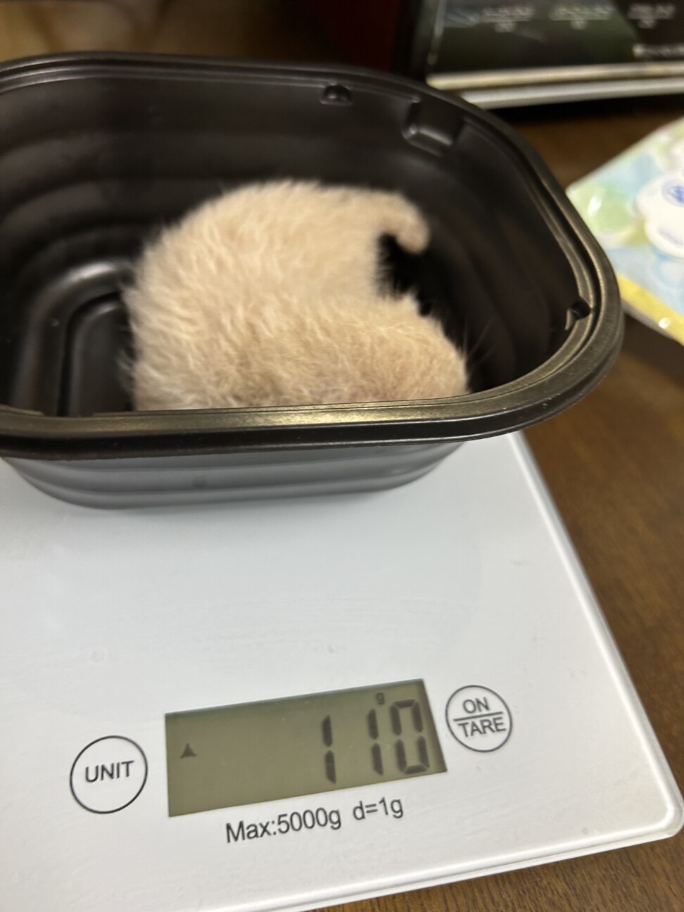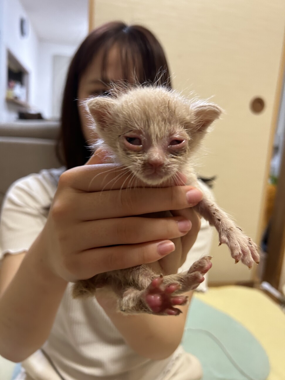 生まれてまもないミルクは110gからスタート。 1番結膜炎がひどく、ずっと目が閉じたままてした。 病院にかけこんで飲み薬と目の中に塗り込む軟膏をもらいました。 インターフェロンの目薬を最初はさしていたのですがひどい状態だったので、しっかり目まで薬が届かず、流れてる状態だったそうです。 ……間に合ってよかった! 今ではしっかり目があき、こちらに向かって歩いてきてくれます(*^^*)