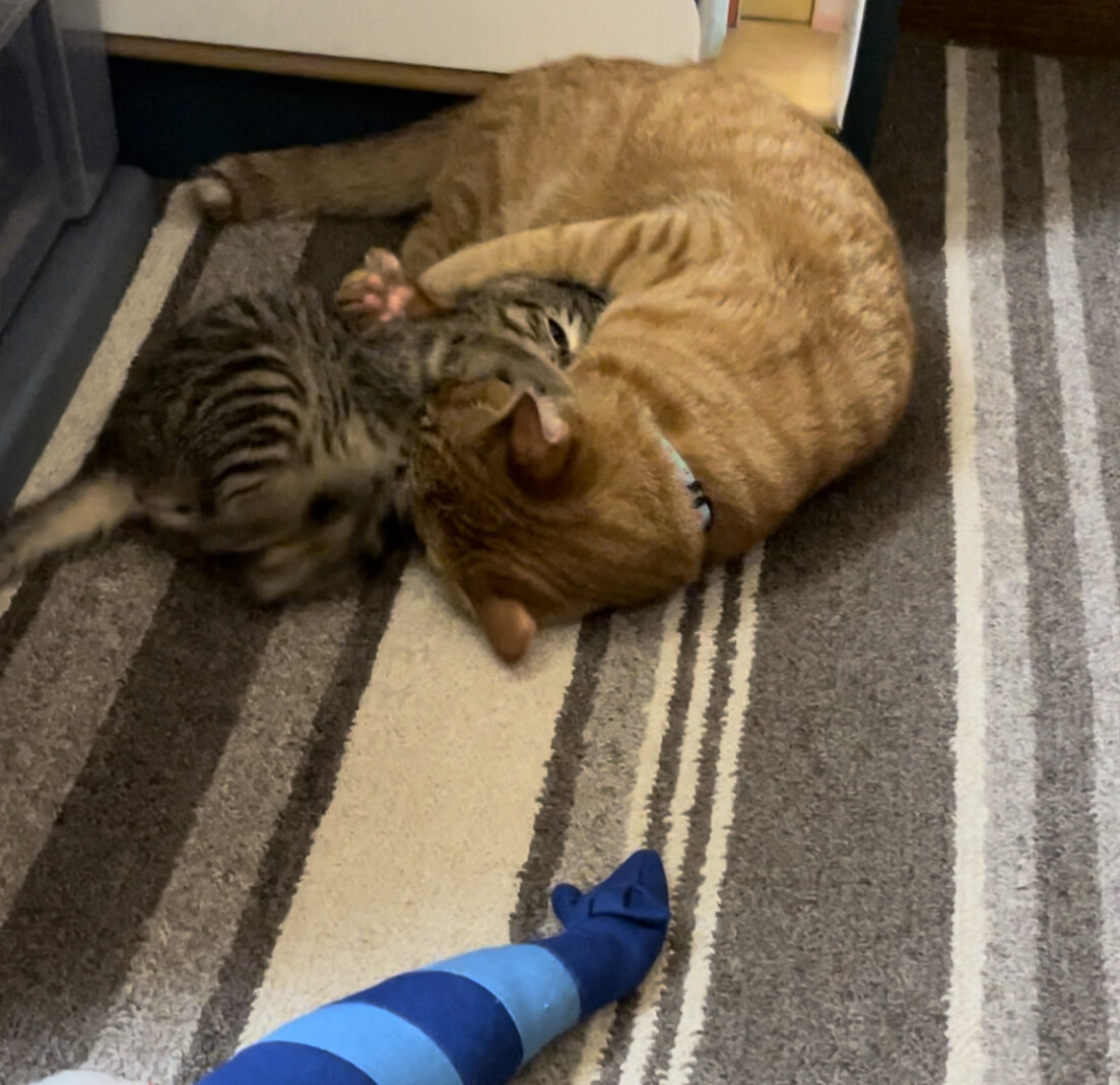 気づいたら子猫の近くで寝ている先住猫 遊びも激しい。 保護6日目まだ里親希望はなし…。 親猫と思われた猫(ややこしいな)もいつ出産するのか分からない。近くの保護団体に電話して相談したいけど何度鳴らしても出てくれない…また明日チャレンジ…お忙しいのでしょう…。