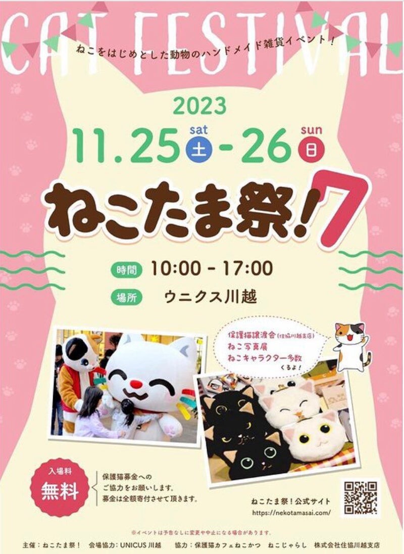 11/25(土)-11/26(日)にウニクス川越で開催される「ねこたま祭」に参加します。 ねこを中⼼とした雑貨アーティストが全国から⼤集合! ボニズハウスからはボランティア裁縫部が猫ちゃんの為を思って作成した、またにゃんベッド、マルチマット、にゃんモック、じゃらし類などを販売致します。 その他ねこ写真展、キャラクターとのふれあいや記念撮影などもある楽しいイベントですのでぜひお誘い合わせの上お越しください! 場所:ウニクス川越 住所:埼玉県川越市新宿町1丁目17番地1