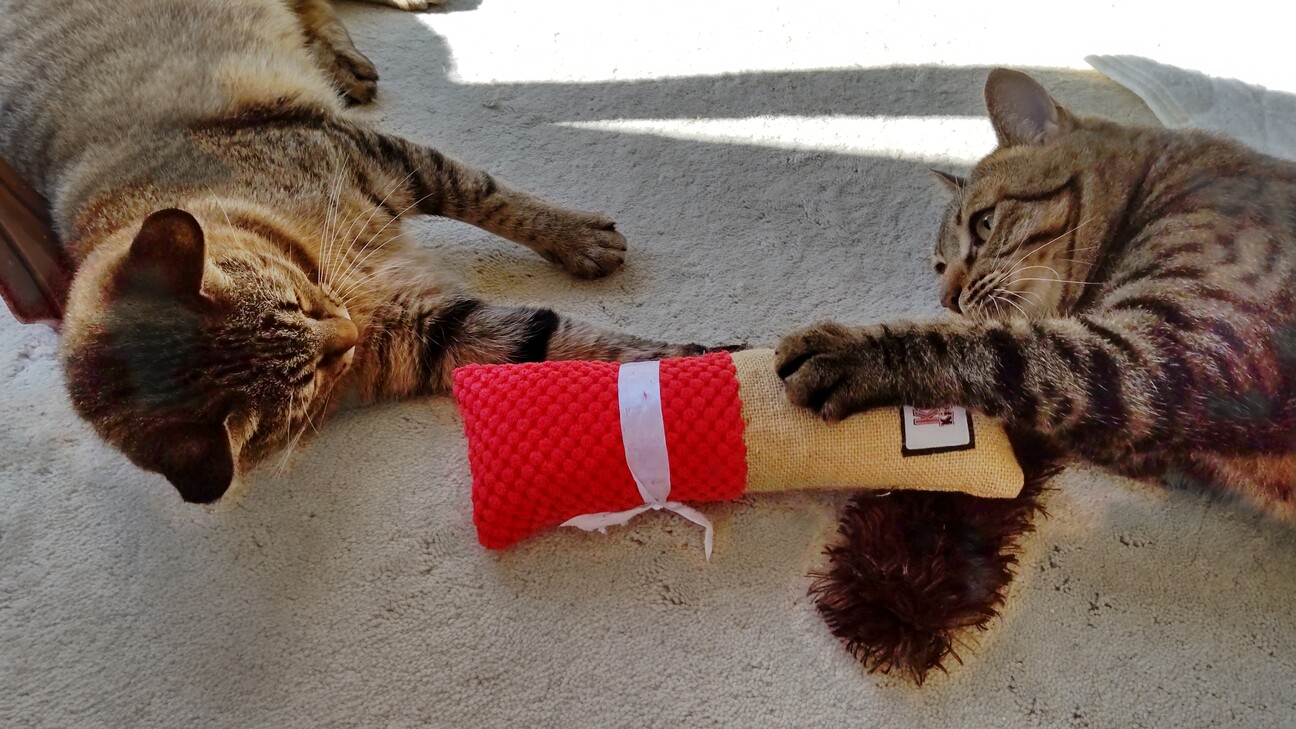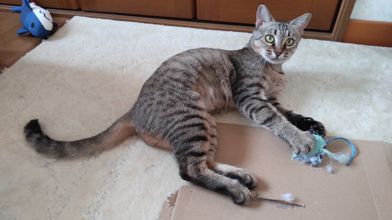 チャッピーは部屋に一人の時は、ネズミのぬいぐるみでハッスルして遊んでいます。1階にいると、ドタドタ遊ぶ音が聞こえて微笑ましいです。一人遊びも好きそうなので、1匹飼いでも全然大丈夫そう。