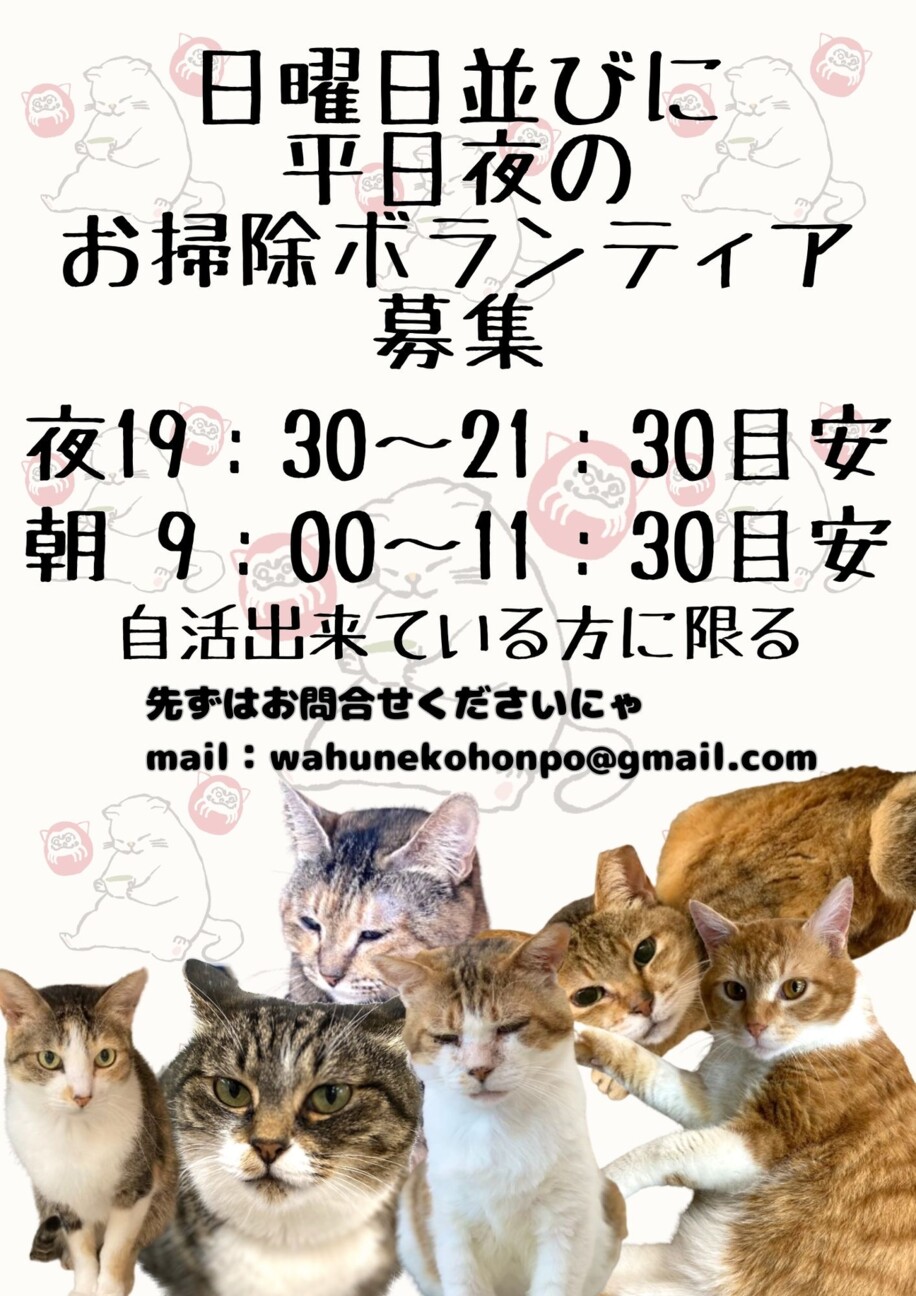 みなさま、こんにちは!和風猫本舗です。 現在、和風猫本舗では当施設で暮らす猫ちゃん達のお世話ボランティアを募集しています。 ご興味のある方はお気軽にメールまたは電話にてお問い合わせください! みなさまのご応募をお待ちしております。 和風猫本舗 電話:047-461-7688(対応時間:13:00~17:30)定休日:日・祝 e-mail:wahunekohonpo@gmail.com