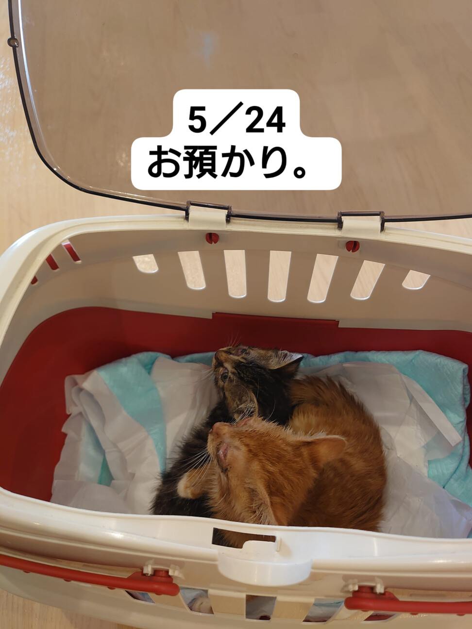 2024.06.01 Facebookより チビ茶トラの風邪が酷くて、他の子にまで蔓延させてたので預かりを提案して預かった2人。 飲み薬目薬ぬくぬくフリースやホットマットの寝床、好きなものを好きなだけとうぞ♪というスタイル。 ん?ん?!預かってまだ1週間?? ってくらい良くなってます