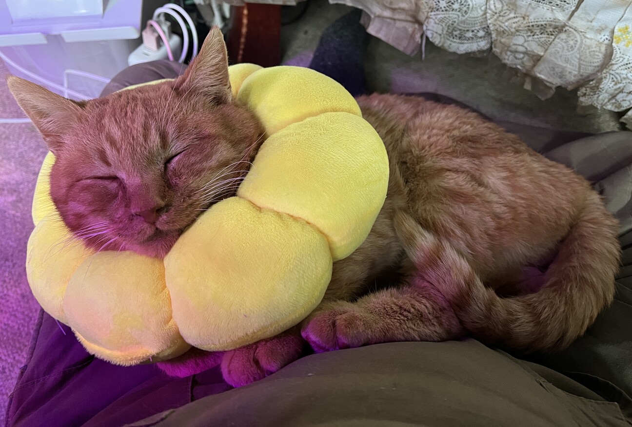 帰ってきたオヅノ氏、硬いエリザベスカラーが邪魔でタワーにも上がれないし、リビングもカラーをカチカチぶつけて歩き回れないのであらかじめ購入しておいて自由に歩き回れることを練習済みのポンデリングに速攻で交換