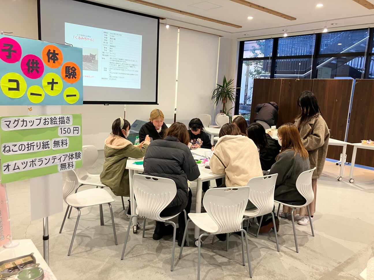 大学生はチラシ配布などをお手伝いいただき、小学生ボランティアは折り紙やぬり絵のブースにて活躍いただきました。