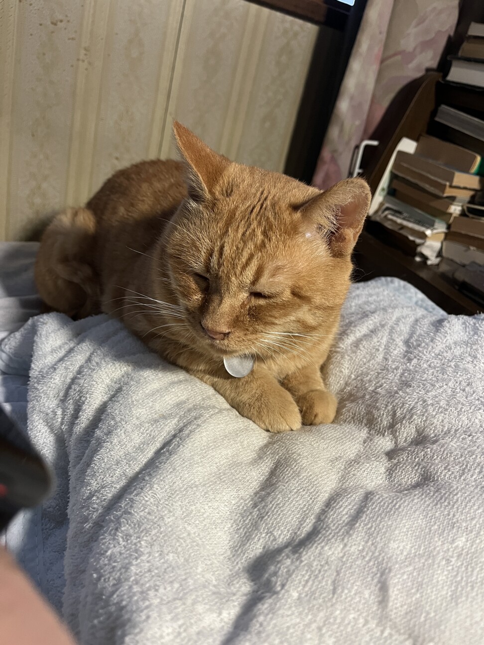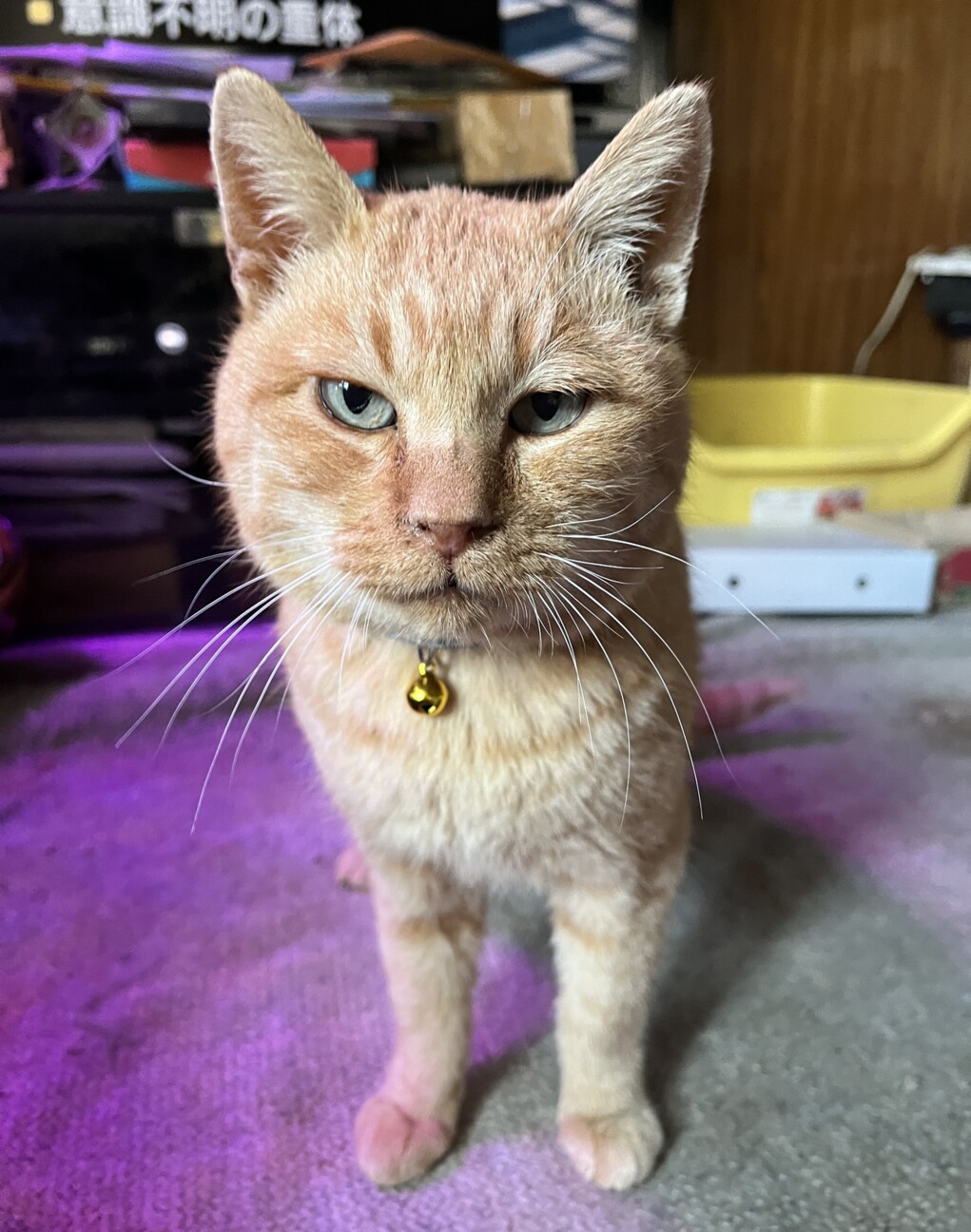 茶トラ4.2kgほどのオス ノルディック柄の青い首輪 迷子札番号#5067227です