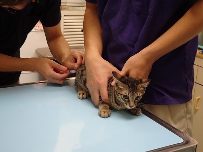 シャーと言わなくなり、手を出しても逃げなくなり慣れてきたので、 思いきって午前中に2匹のワクチン接種(2回目)に行ってきました。 洗濯ネットを使わずに頑張って診察台に出したのですが、 最初はレオくんも暴れましたが、堪忍して落ち着いてくれ無事にワクチン終了。 続いて幹太くんの番、静かに首をつかんで診察台に乗せたのですが、 看護士さんにバトンタッチした途端、かなり暴れてすぐにキャリーへ戻し 洗濯ネットに入れてのワクチン接種になりました。 でも、家に帰ってきてケージに戻しても怒る事無く落ち着いていて 安心しました。