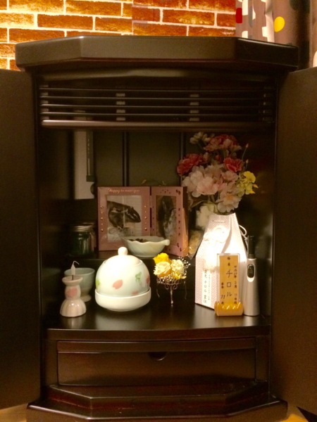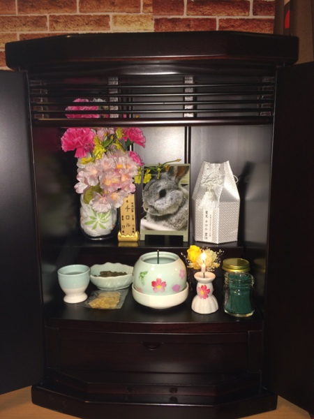 2枚目の写真は最初に飾ったのですが、ライトを点けたかったので、またやり直しと2年前に亡くなったシマリスのライチの写真も一緒に飾ろうと思いました。