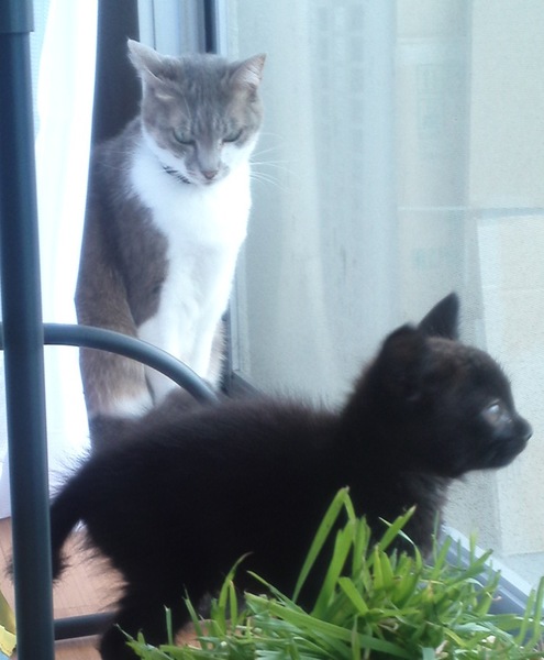 次郎が家に来て早4日。小さい体で家中を走り回る毎日。 先住猫が3匹いるが、次郎は小さい声でフーフー。 だがしかし3匹の後をしばしば着いてまわる。 そんな次郎に一際関心を寄せてるのが富士子。 富士子は4歳。 12歳のハリーと15歳の銀太は朝食後は即寝。いつも富士子は猫砂を転がして一人遊びをしていた。 そんな富士子が今日はずっと次郎を見守っている。 ・・・これは・・・仲良しになれるんでないの? ダンボールに入った次郎をもぐらたたきのようにもしている。 ふむ・・・いい感じ。