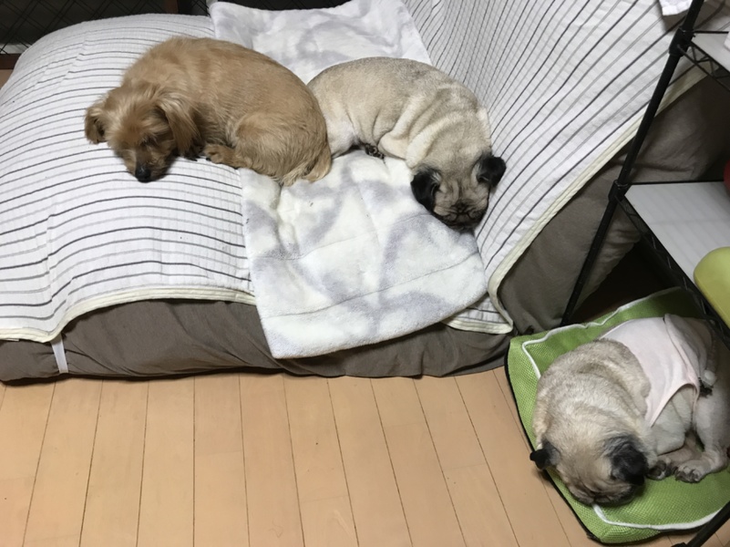 パグの家族の一員になり、パグ達と生活をするようになって一日中寝ていますが、いつも笑顔で元気に過ごしています。