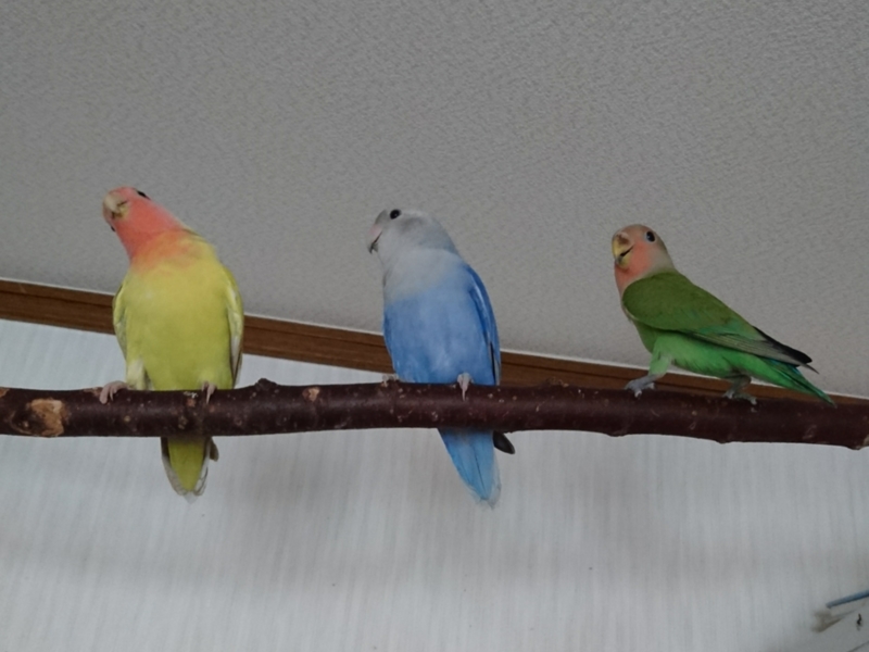 2018年6月9日 コザクラインコの空くん(通称ソラッチ)と梅ちゃんがこちらのサイトのご縁で家族になりました。 家に到着し、直ぐに放鳥したのですが、ケージ上部に置いた水飲み用お皿を見つけると、早速水浴びしていました(゜ロ゜) 2羽ともに良い子で、止まり木等に止まっていたかと思うと頭に飛んできてくれて、嬉しい限り。 とっても愛情深く育てられていたんだなぁと感じました。 これから我が家で生活するからね。 もっともっと仲良くなろうね。 写真は、 ①左から、愛さん、ソラッチ、梅ちゃん ②水浴びしたずぶ濡れソラッチと梅ちゃん
