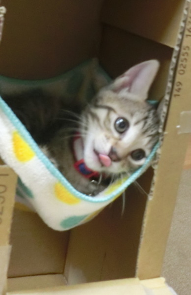 段ボールの四隅にカッターで小さな穴を開けて、内側からタオルの四隅を押し込んで、外側に出た端を養生テープで止めただけです。