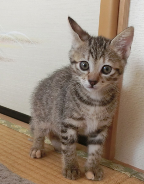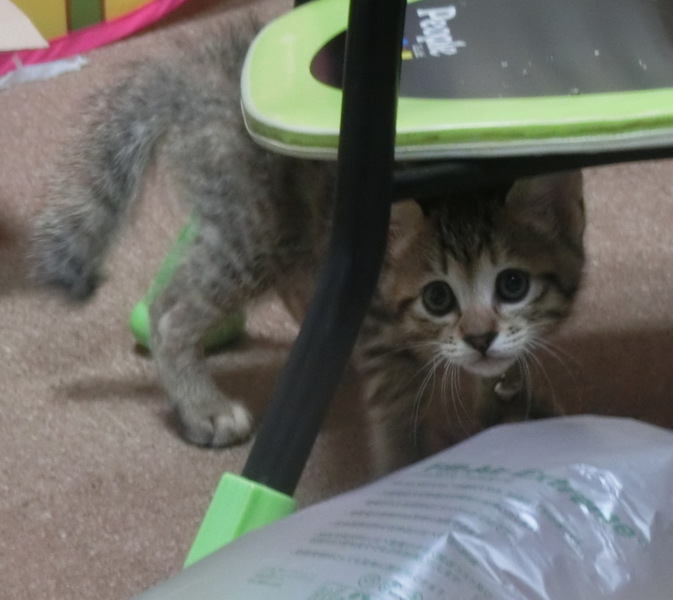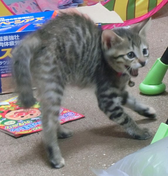 子猫でも一生懸命毛を逆立てて尾を膨らませて威嚇します;