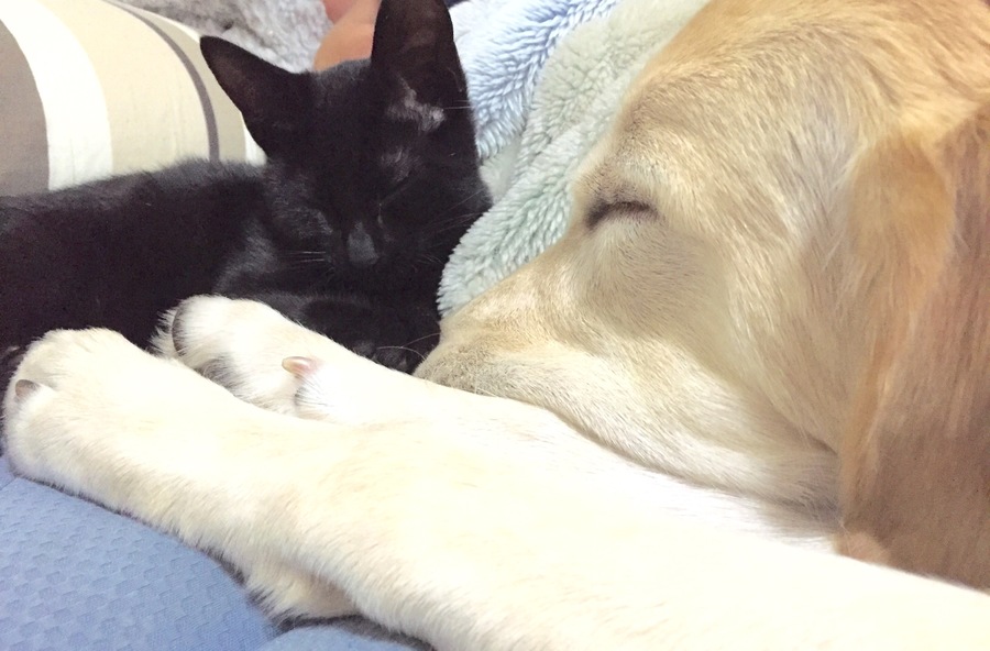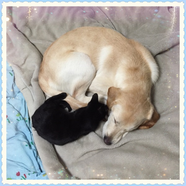 昨夜は2匹で白と黒のハート型になって寝ていました。