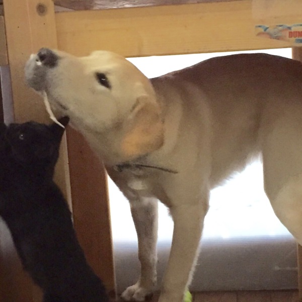 今日は教えたわけでも指示したわけでもないのにコルトが自分のおもちゃをチェロに持っていって渡し遊びに誘っていました。