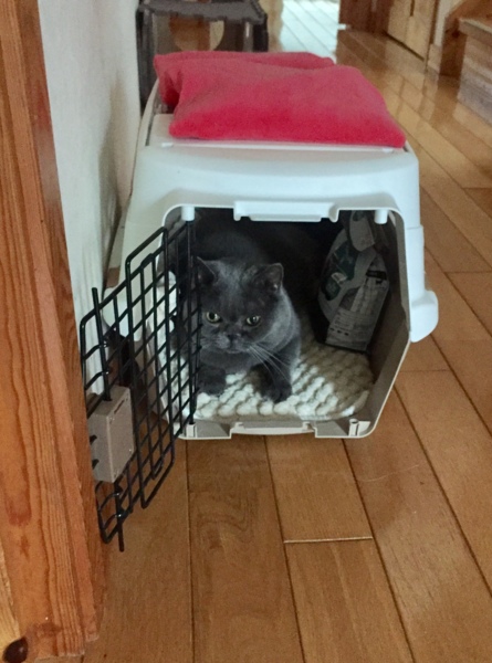 台風19号 接近中! 万一の備え、避難出来る様に 猫避難に必要な物を、 色々玄関前に準備しました。 猫ケージそれぞれにフードと毛布 タオル他入れました。 ケージは予備の新品1個、で計3準備しました。 トイレも普段のお気に入り1個、予備1個 新品1個 計3準備。 おっとり、センシティブ性格のウィルは、普段と違う雰囲気を察したのか、早速ケージ内にお籠り。良い子いい子。 一方、天真爛漫、元気娘、ベッキーは、全然平気の平常心!相変わらずお腹ゴロンで 遊んで、遊んで〜の甘え攻撃。 外の暴風雨なんて全く関係ない! 台風が何事も無く通過してくれる事を願うばかり。