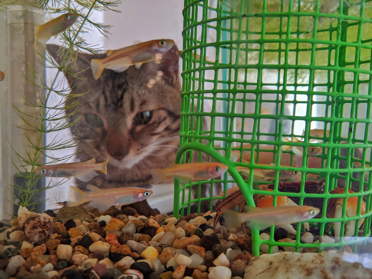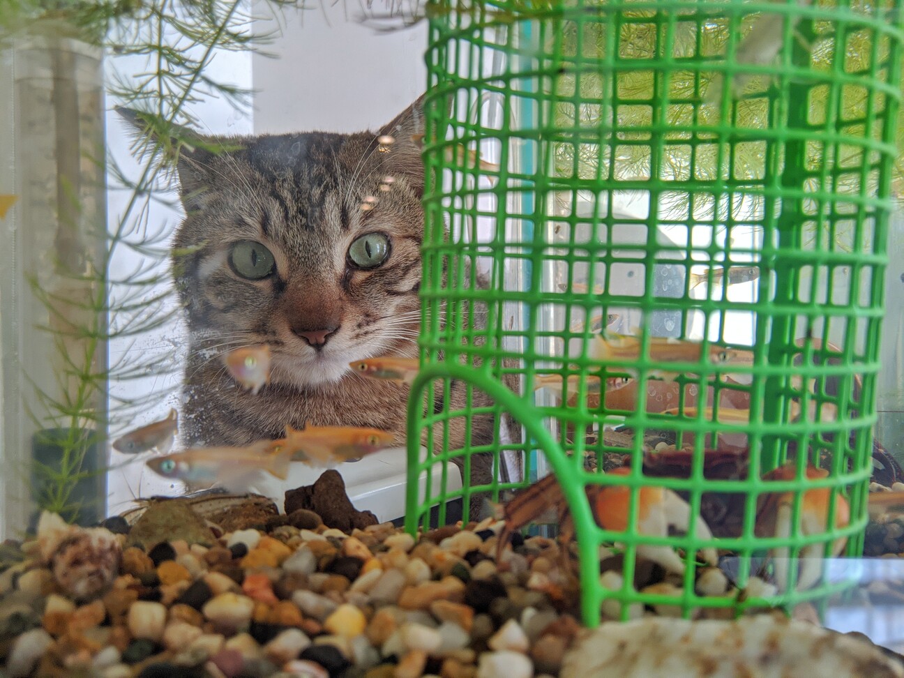 あと、水槽にメダカを入れたら、水槽を眺めるのが気に入ったようで、よく水槽のそばでくつろぐようになりました。