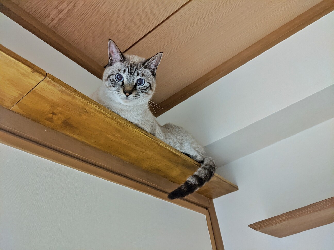 子供たちが賑やかな日中、ビビりなしろちゃんはまだまだクローゼットなど暗いところに潜んでいることが多いので、子供たちの手が届かないところにキャットウォークを作ってみました。