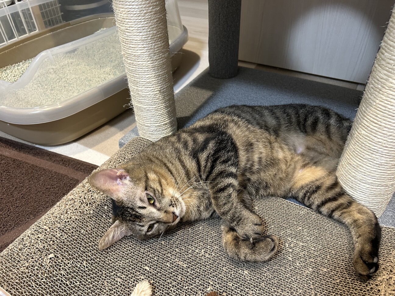 ケージのベッド以外でも寛ぐことも増え、撫でたりブラッシングをするとお腹を見せてゴロゴロ喉を鳴らします。