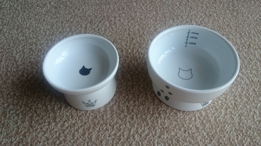 写真1:猫壱の脚付き食器。エサ用(左)と水用