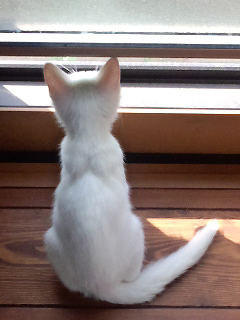 愛護センターから98gの乳飲み子で引き取った子猫。 130gの時にあぶない状態になって、病院で皮下点滴と栄養剤、抗生剤を入れて回復し、順調に育った。 里親様から、背中に「天使の羽」があるように見えると。 本当に猫ちゃんが天使に見えるのでしょう。