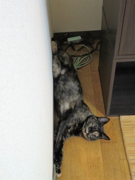エアコンは好きじゃないようで、部屋のいたるところの狭いフローリングや風の通り道を見つけては、こんな調子で、お腹を天にして似ています。