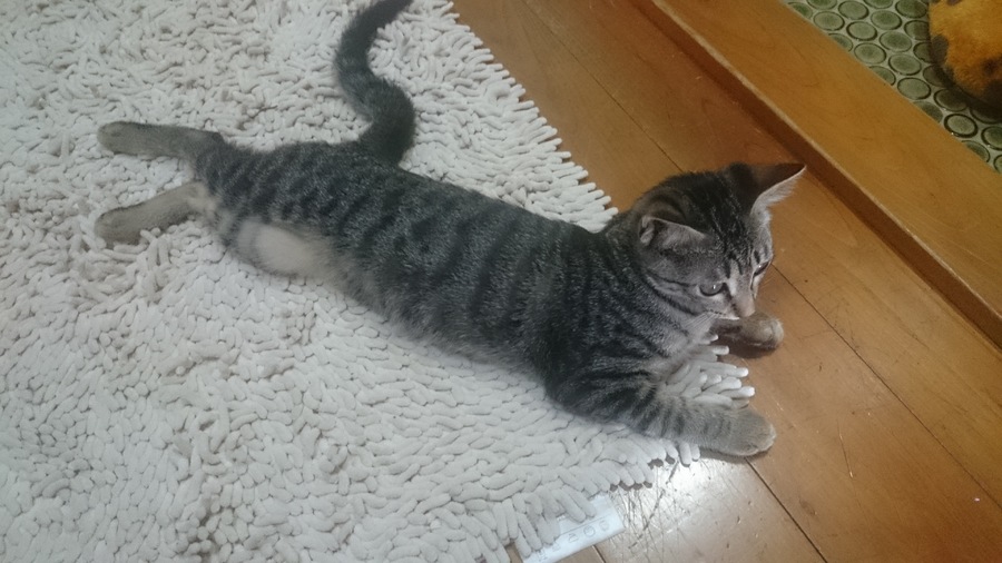 写真1:洗面所前の足ふきマットに寝そべり、玄関の様子を伺う雅(みやび)