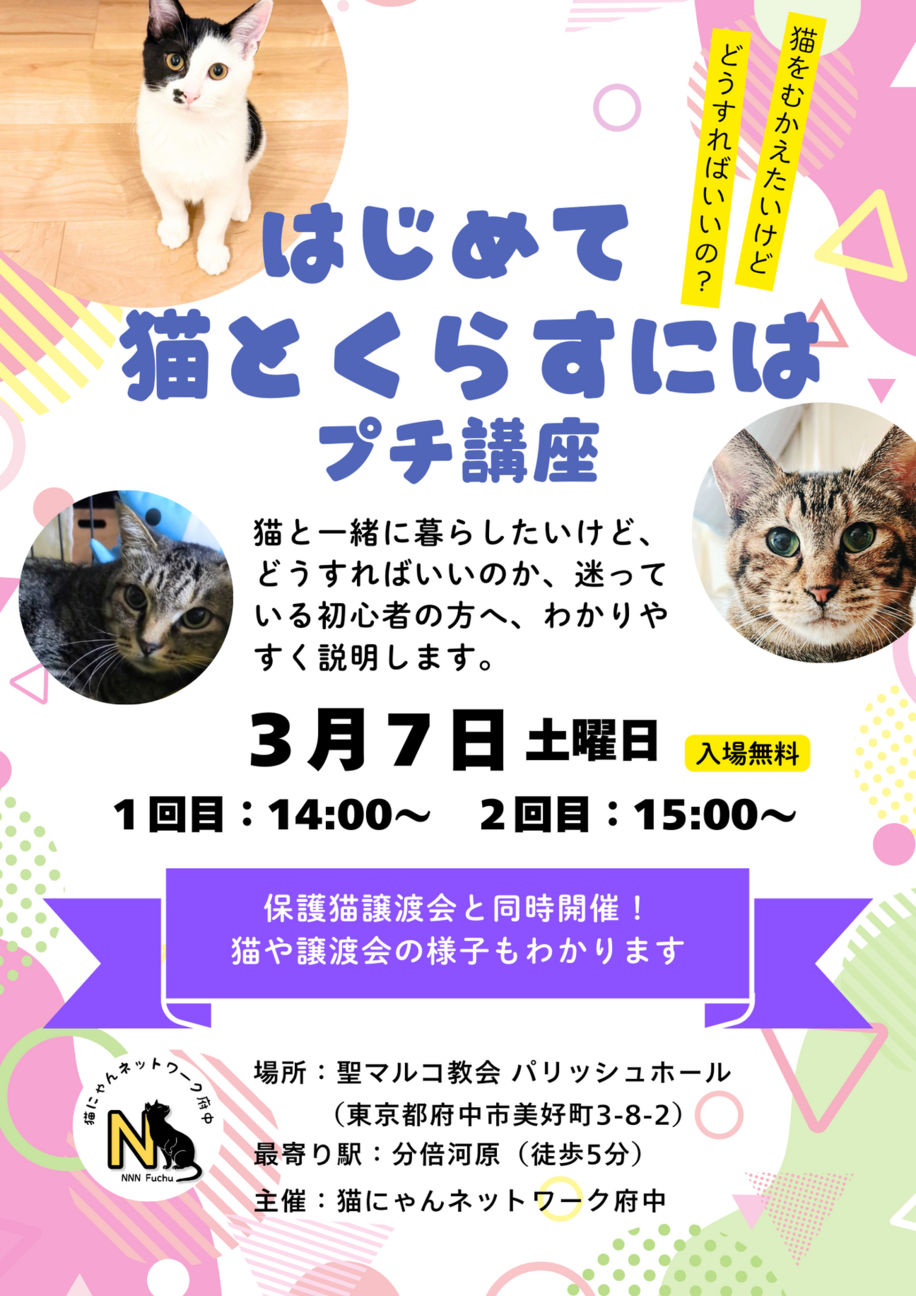 「はじめて猫とくらすには?」プチ講座 猫と暮らしてみたいけど、 「何から始めればいいの?」 「譲渡会ってどんな雰囲気?」 そんな初心者さんに向けた、やさしく学べるミニ講座です 保護猫譲渡会と同時開催なので、実際の様子もわかります ━━━━━━━━━━━━━━ 3月7日(土) 1回目 14:00~ / 2回目 15:00~ 聖マルコ教会 パリッシュホール (東京都府中市美好町3-8-2) 分倍河原駅より徒歩5分 入場無料 ━━━━━━━━━━━━━━ これから猫との暮らしを考えている方、 ぜひお気軽にお立ち寄りください 主催:猫にゃんネットワーク府中