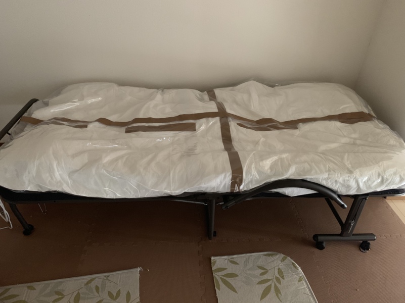 考えに考えた末、元々爪とぎ防水に購入していたビニールシートを粘着テープで繋ぎ合わせて巨大なシートにして、寝る時以外はそのシートで布団全体を包むようにして覆うことにしました