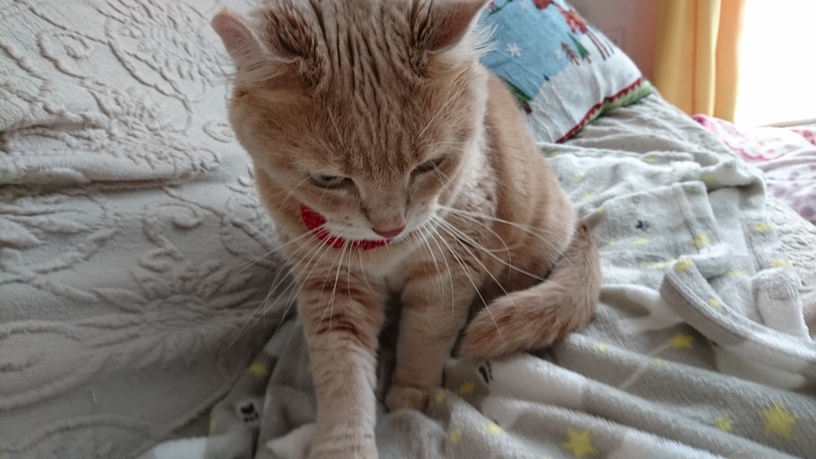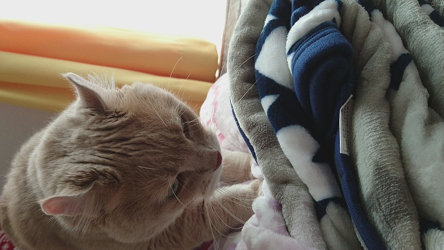 普段ソファには乗りませんが、今日はスリーコインズでフリースの膝掛けを購入。かわいい柄で気に入ってソファに置いておくとごはんさんが釣れました~