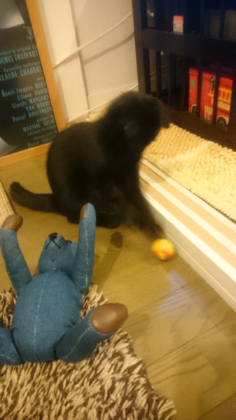 私の手作りオモチャが一番気に入ってくれ、釣りタイプの先っちょにモヘアのカタマリをくっ付けた物をところ狭しと駆け回り、追いかけっこしています。(^-^)何ともペット用品販売会社に勝った気分で最高です。笑