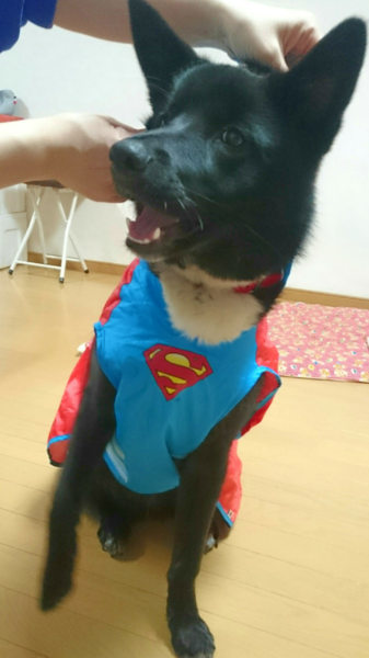 おさがりのスーパーマンのレインコートを、犬友達さんからいただきました!