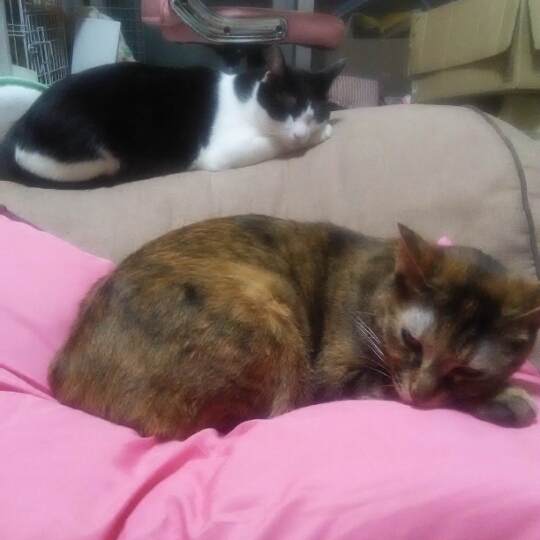 お♡は♡よ(*Ü*)ノ" トラとライチは元気だよ★(﹡ˆ﹀ˆ﹡)♡ 二人とも枕が大好きみたい♥ 居心地いいみたいW(๐^╰╯^๐)♬ 今日はいい天気✩一緒にひなたぼっこしようかな♪(*n´ω`n*)