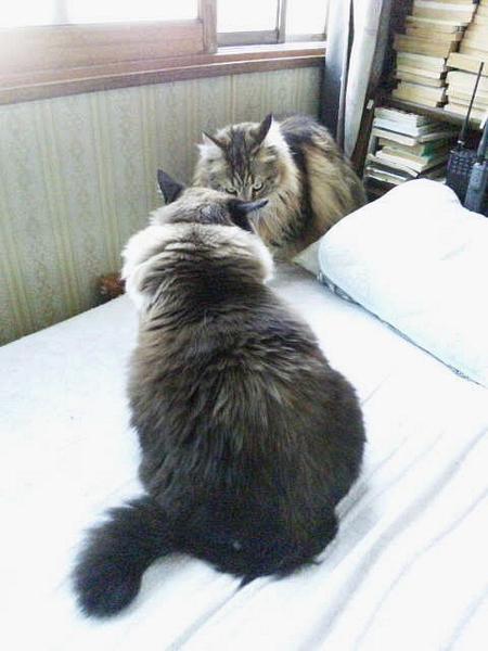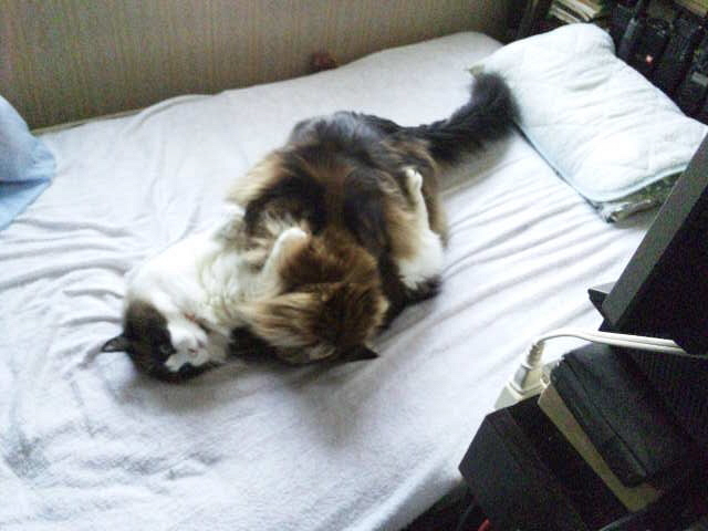 そこは猫どもにとっては見晴らしが良くかつ涼しいという絶好のポイントなのですが、いかんせん大猫二匹がいっしょに納まるというスペースではありません。