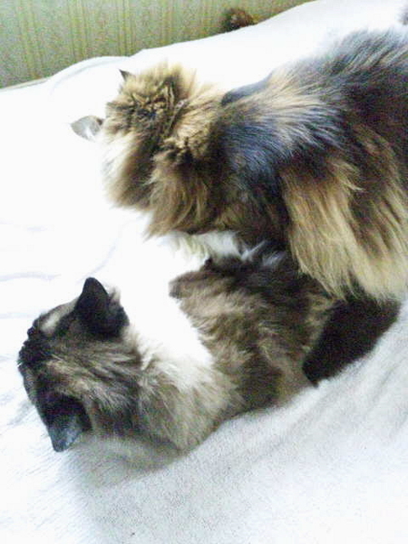 けっこう「フギャァァ!」という声が開けた窓から隣家まで響いていたと思いますが、喧嘩といっても組み伏せて毛を口で毟り取るくらいなので、流血の惨事というわけではありません(笑)