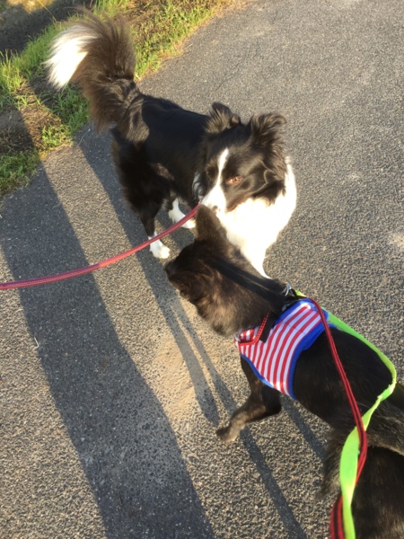 写真はトイプードルより一個上のサイズのプードルのおかあさんに鹿ジャーキーもらって食べてるところと、朝の散歩でボーダーコリーのお姉さんとのあいさつです。すずがデカく見えるけど実際はボーダーコリーの方がふた回りほど大きいです。