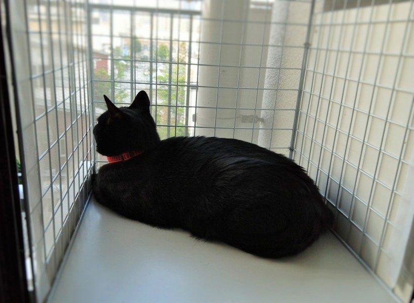 いつもは出窓の所で立ったり、座って外を見ていることが多いのですが、網戸のネットで周囲を囲ったら、落ち着くのか寝ていることもあります。