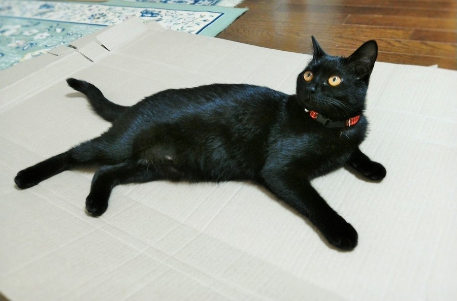 ダンボールの上でゴロンと横になってしまいました、「爪とぎ」は中断・・・。