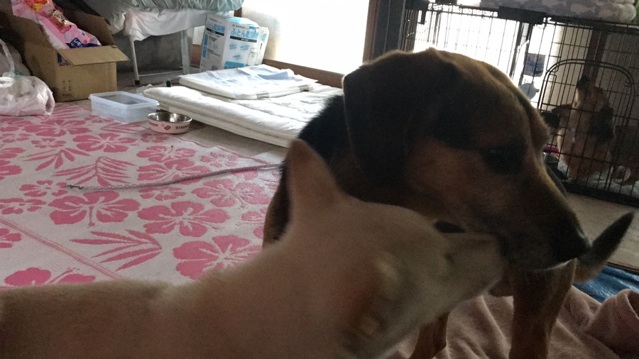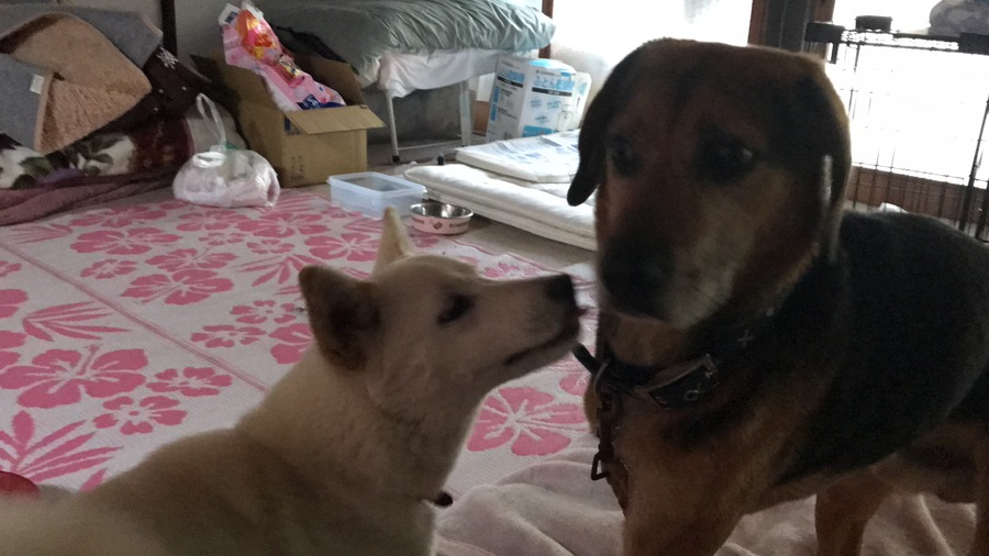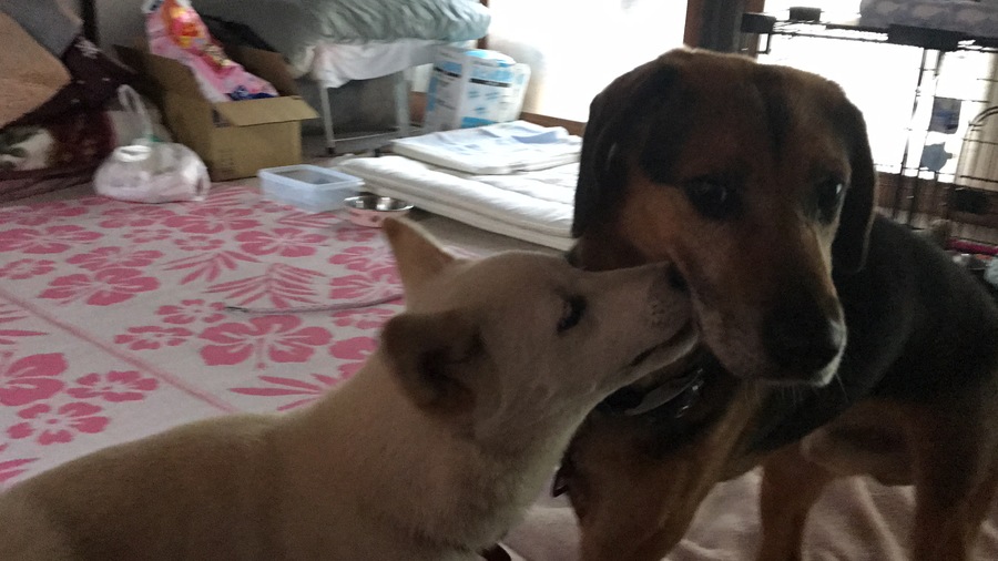 こんにちは٩(•౪•٩)三 昨日は結局家に帰り着いたのが 23時半頃(゚゚;) 遅ーい帰宅となりまして。 ワンコ達はご飯も食べず 疲れて寝てしまいました(>_<;) 朝起きてから、ご飯完食☆ 疲れが先だったようです(^-^; ご飯を食べ終わり 吠えるモモちゃん。 離すとお家の中を ドタドタ言わせながら 走りまくりεε=(((((ノ・ω・)ノ コテツにちゅーしました(∩∀`*)♡ コテツはまだ慣れてない様子。 ガロちゃんとモモちゃんは 既に仲良し(๑•ڡ•)♡(•ڡ•๑)