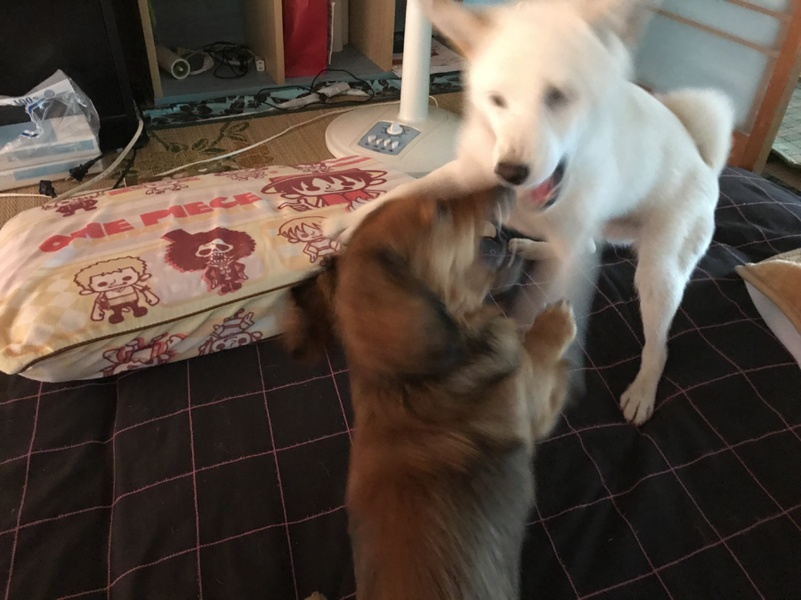夜から朝まで暴れまくる ワンコ達(゚゚;) 毎日毎日ワンワン合戦なので 寝るにも寝れなく 毎日寝不足状態(›´ω`‹ ) 1匹鳴けば3匹鳴く この連鎖の繰り返しで 寝てても目を覚ましてしまいます(^-^; すっかり仲良くなり ガロちゃんはモモちゃんに パンチ(っ>ω・)つ)o゚)∵ 喰らいまして( ・ _ ・ ) そしてお尻をガブっ!!! いいお尻してるのかな…?(^_^;) モモちゃんもお座りを覚えて みんな集合させてのお座りで パシャリ( ∩'-'