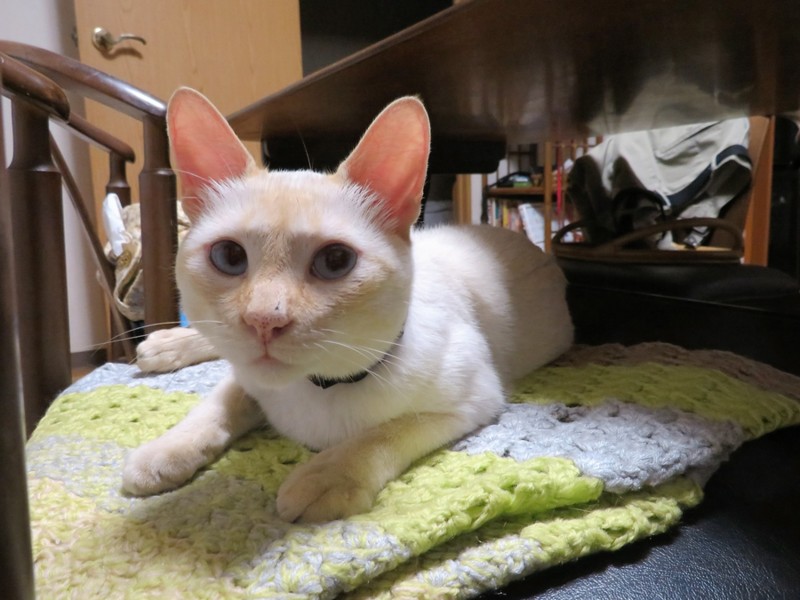 猫が好む場所は同じなのか、ゆっち姐の匂いが好きなのか、コタ坊は最近、2枚目写真のように、手編みブランケットの上に寝ています。(1枚目のゆっちゃんは我が家に来た昨年6月頃の写真)