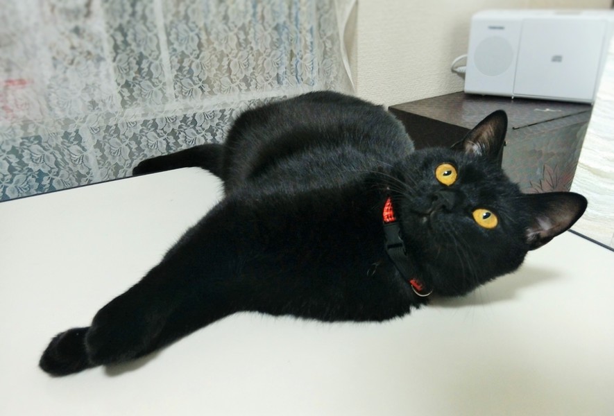 私が、コタツのテーブルで何かしようとすると飛び乗ってきてゴロゴロしながらジーっと見ます。